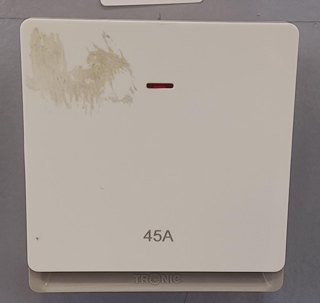 This is a high-capacity cooker control switch rated at 45 amps, designed for heavy-duty appliances such as electric cookers, ovens, or water heaters. It ensures safe switching and isolation of high-power circuits.