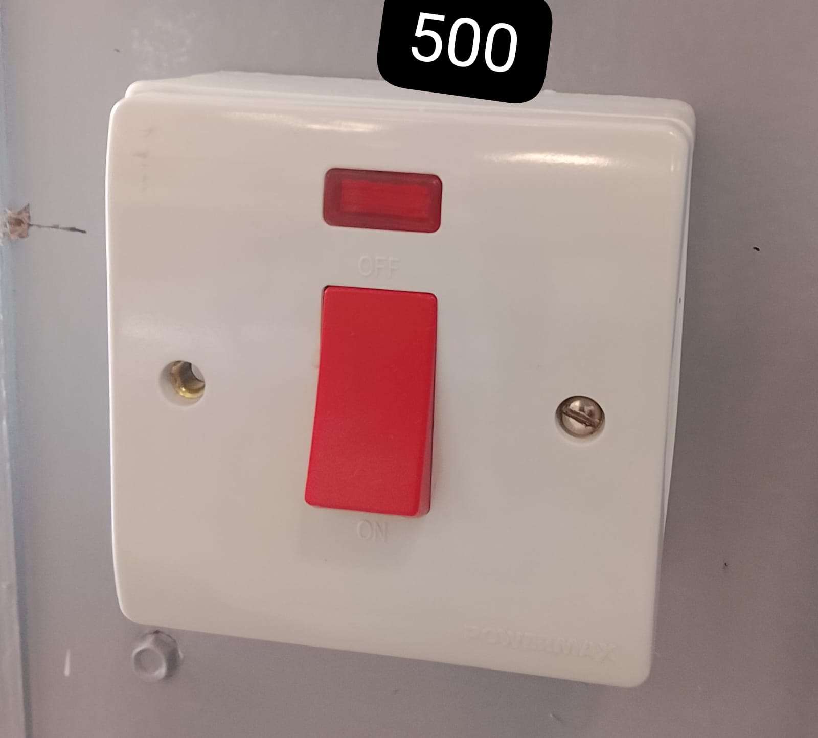 Dual-function control unit combining a 45A cooker switch and a 13A socket outlet. Features red rockers with neon indicators for clear ON/OFF status. Ideal for kitchen appliance control and auxiliary power supply.